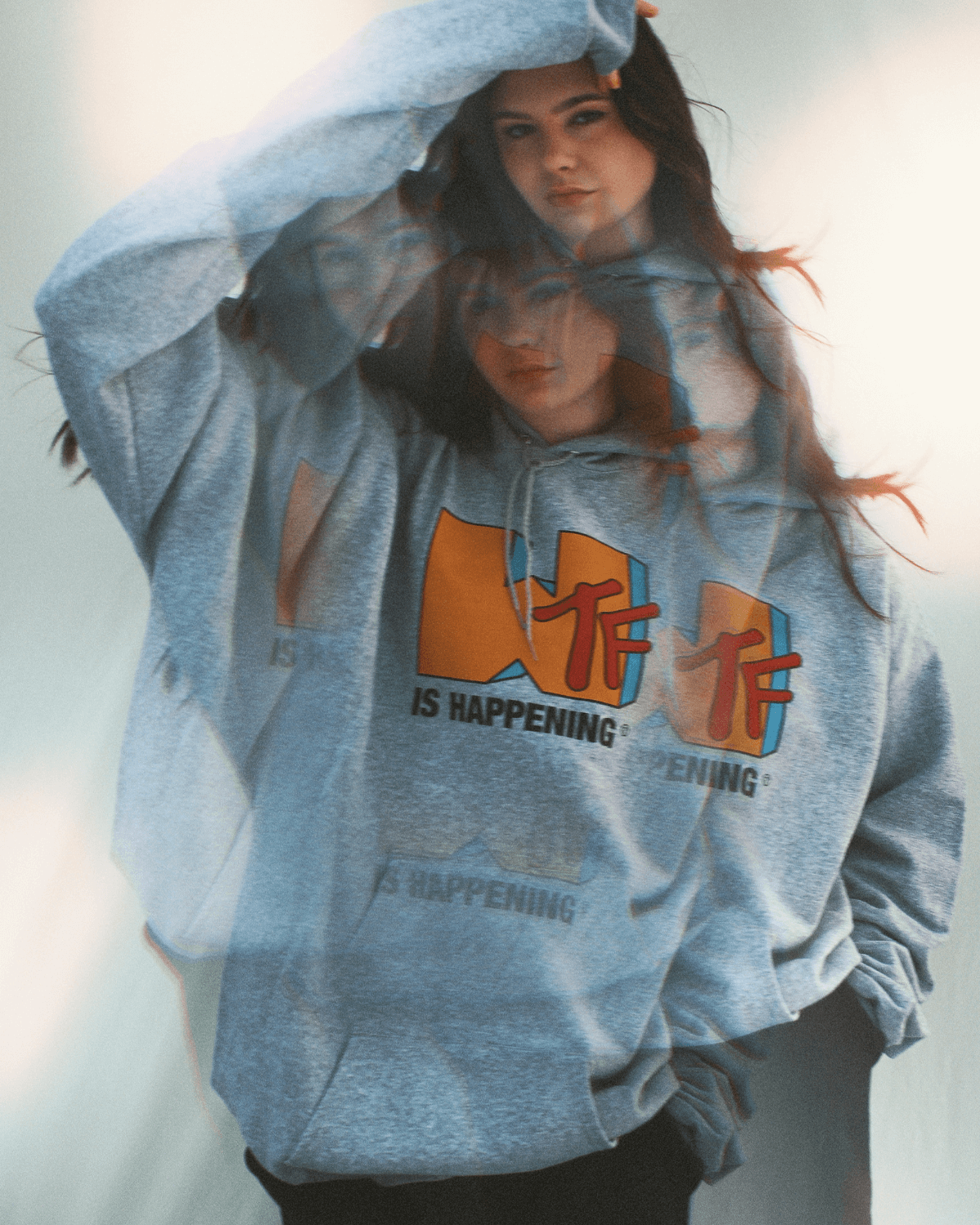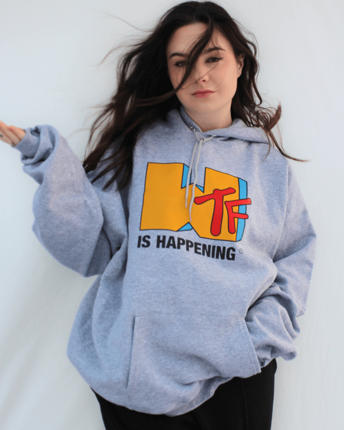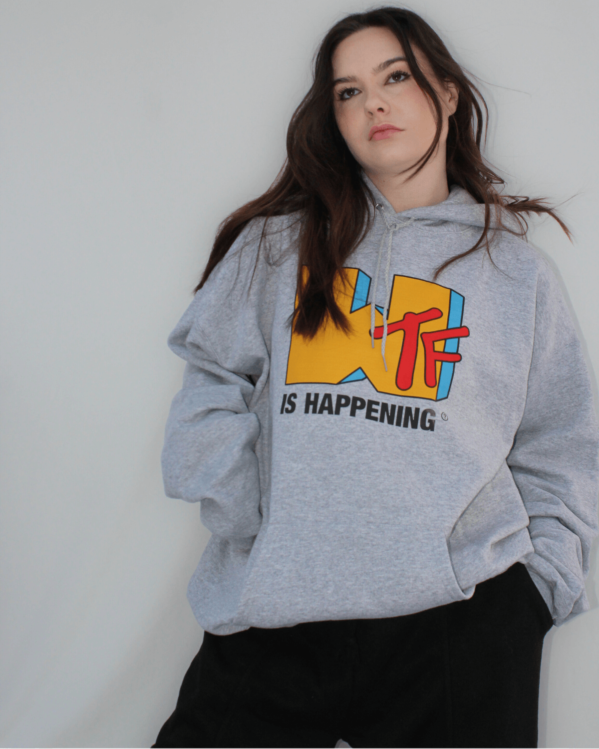 Introducing our "WTF" is Happening Hooded Sweatshirt - a sustainable and aesthetic choice made with recycled polyester and sustainable cotton.
