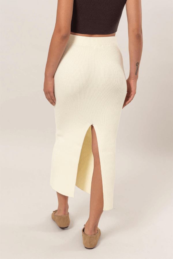 Indulge in ultimate comfort with our Cream Knit midi skirt. Made with a luxurious blend of acrylic, polyester, and nylon, our skirt features a high waist and back center slit for effortless style and movement. Its non see through material ensures you can wear it for any occasion while hugging your curves and leaving a lasting impression.