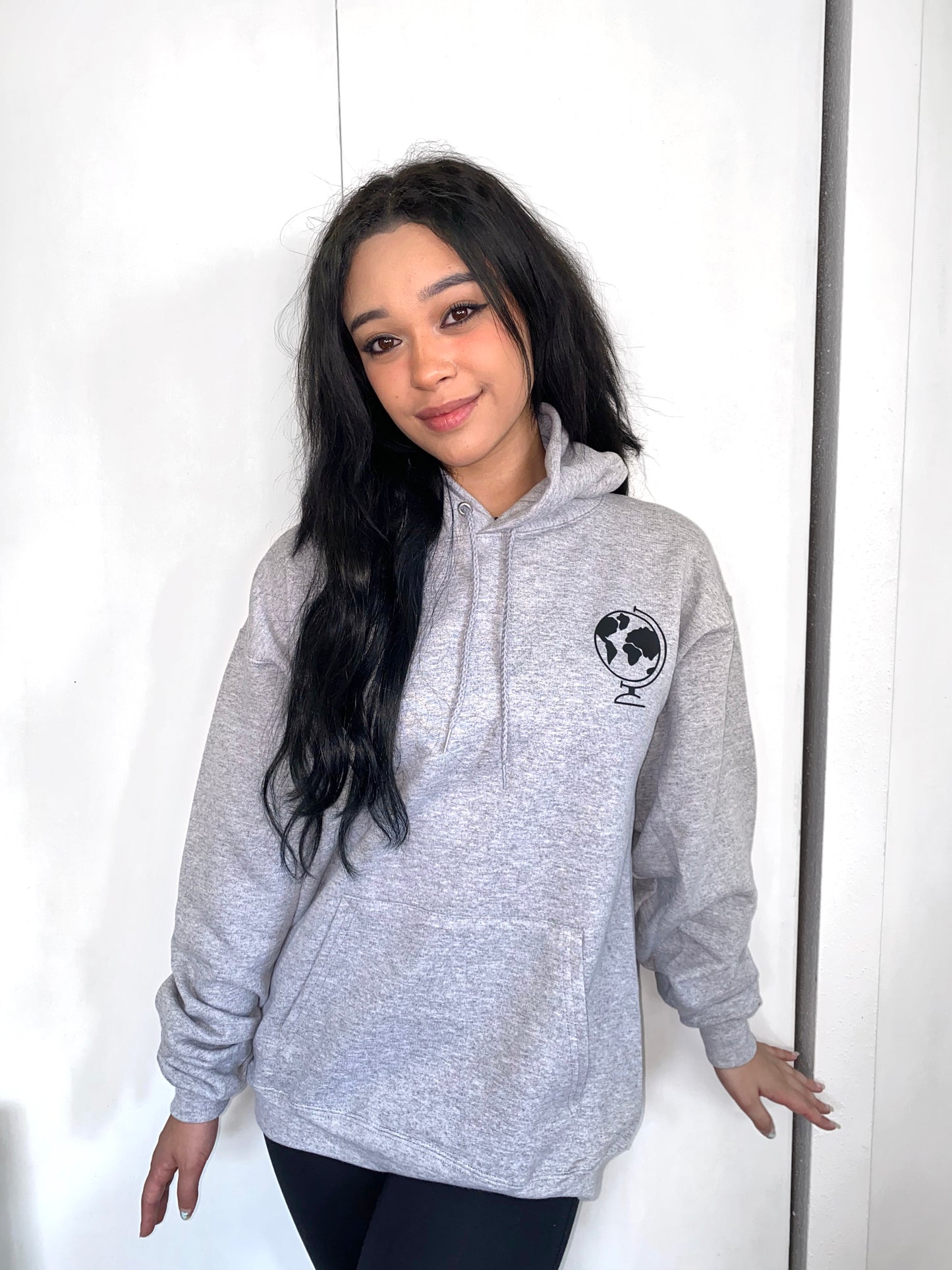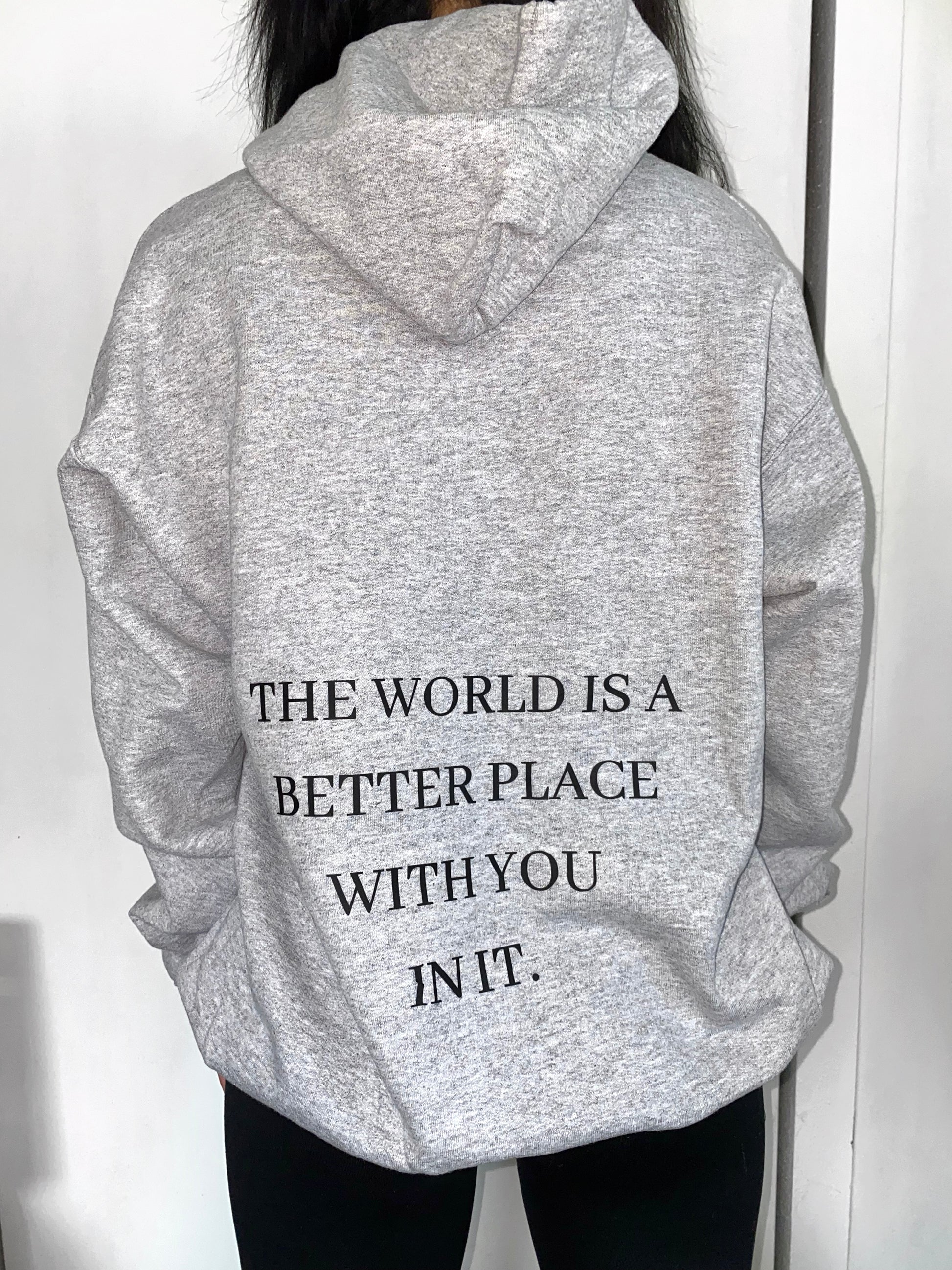 Difunde alegría este otoño con nuestra nueva sudadera con capucha. Esta sudadera con capucha tiene un globo terráqueo en la parte superior izquierda del frente y "El mundo es un lugar mejor" en la parte posterior. Esta sudadera con capucha es perfecta para difundir un mensaje positivo.